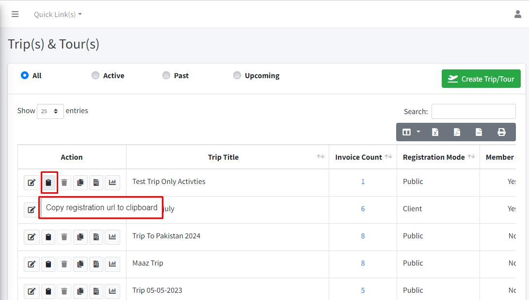 - Go to the Trips & Tour List Screen & Copy the registration link and Paste the link into a new tab.