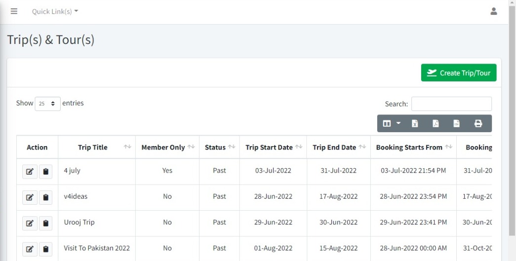 - Navigate to the menu click on Trip(s) & Tour(s) and you will land on Trip(s) & Tour(s) page, an existing Trip(s) & Tour(s) list will be seen (if any).